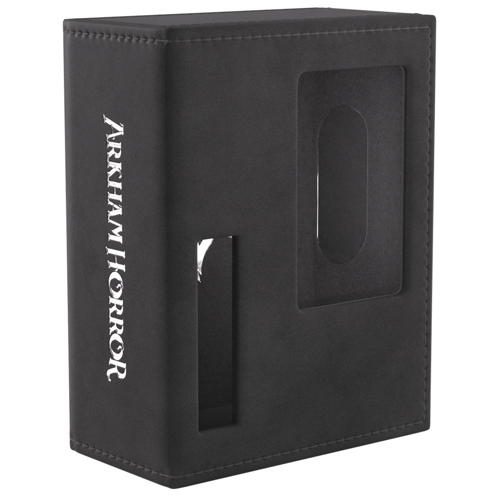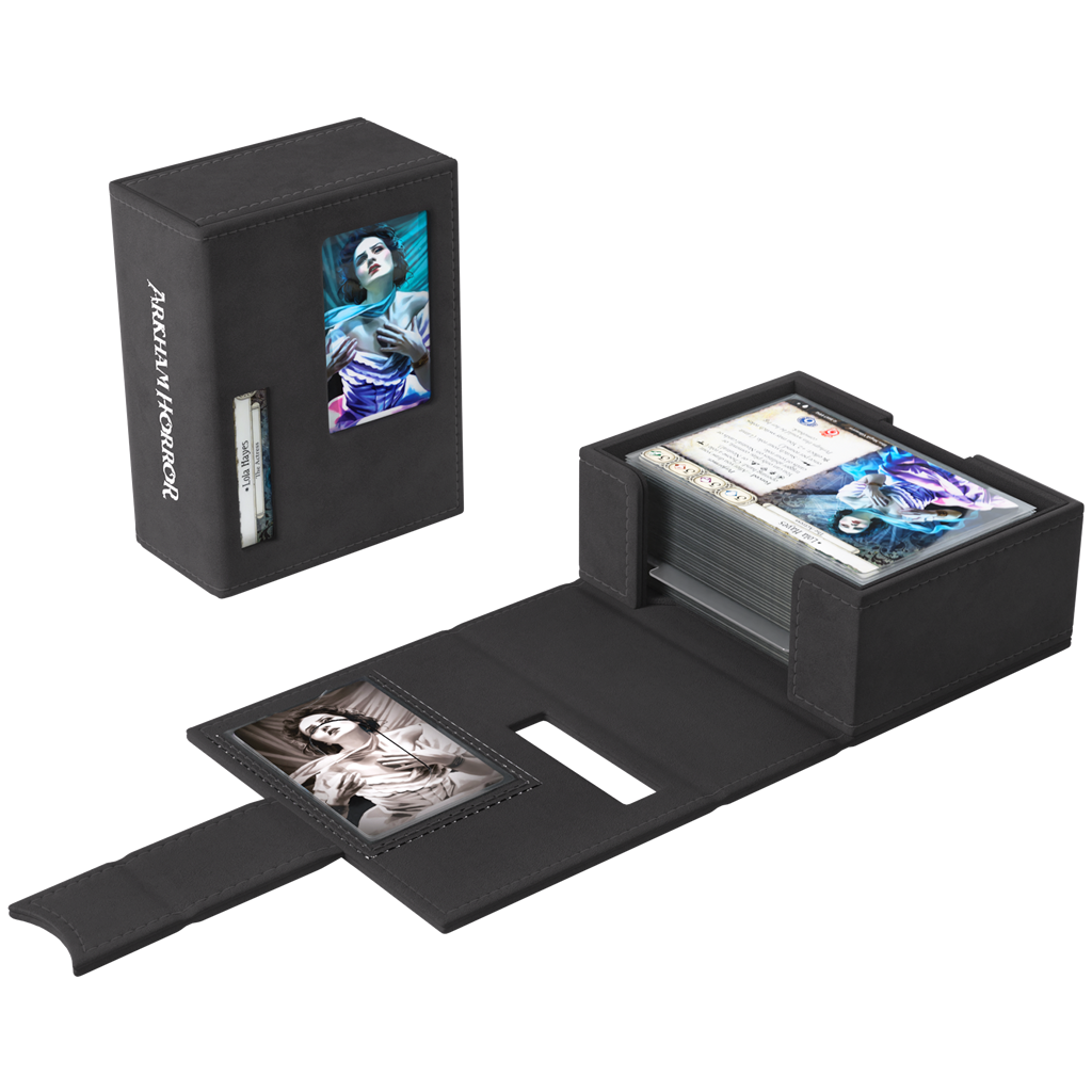 Con un elegante exterior en negro con detalles en foil de color, su nuevo aspecto encaja perfectamente con la atmósfera del juego. Esta caja premium para mazos con licencia oficial ha sido diseñada específicamente para satisfacer las necesidades de los jugadores de Arkham Horror: El juego de cartas.