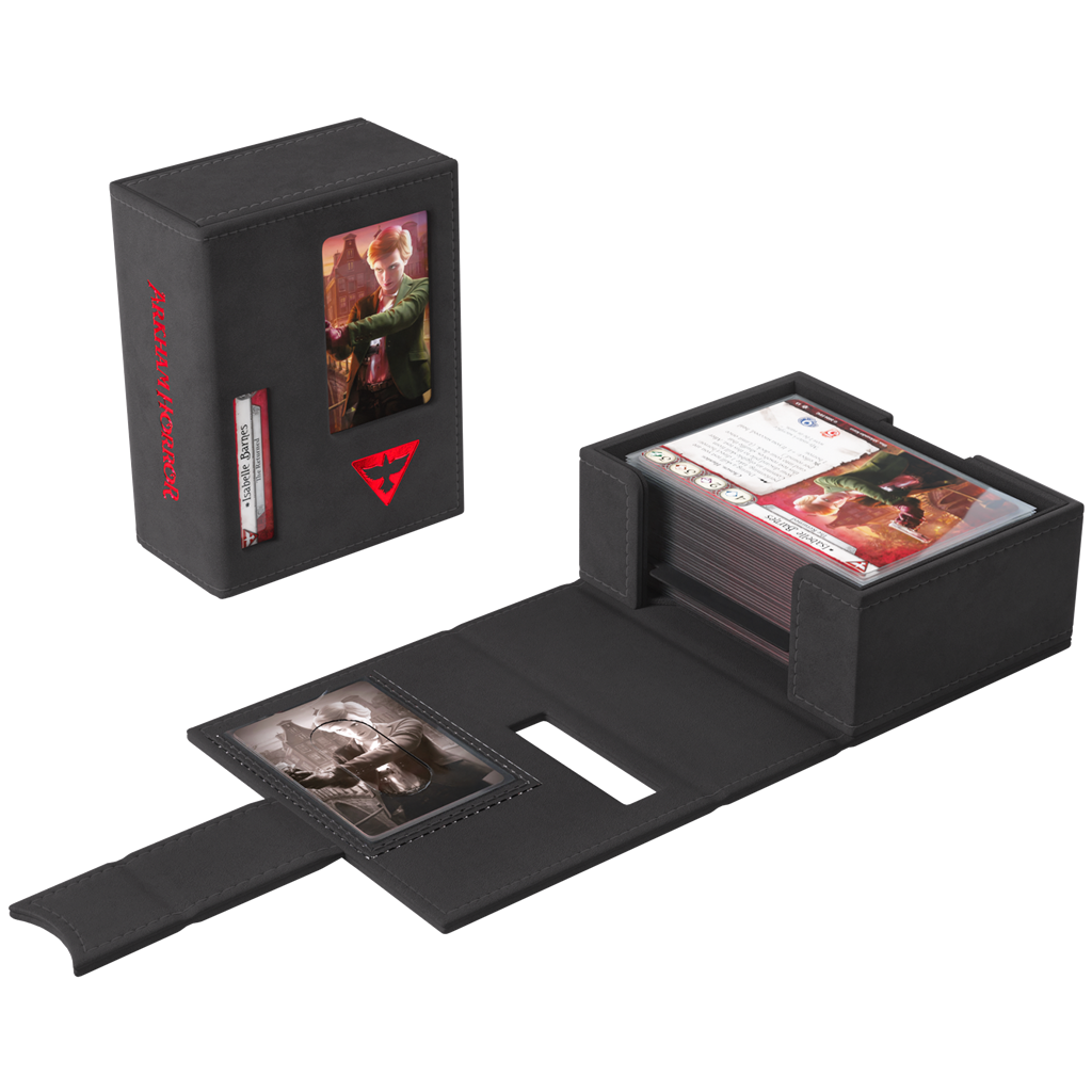 Con un elegante exterior en negro con detalles en foil de color, su nuevo aspecto encaja perfectamente con la atmósfera del juego. Esta caja premium para mazos con licencia oficial ha sido diseñada específicamente para satisfacer las necesidades de los jugadores de Arkham Horror: El juego de cartas.