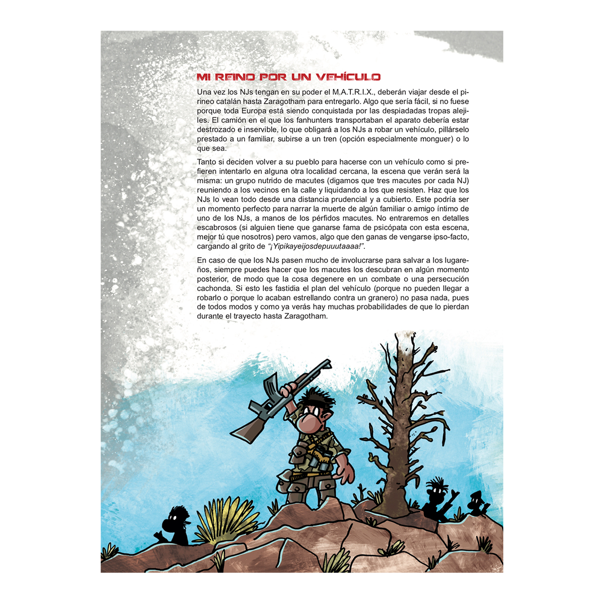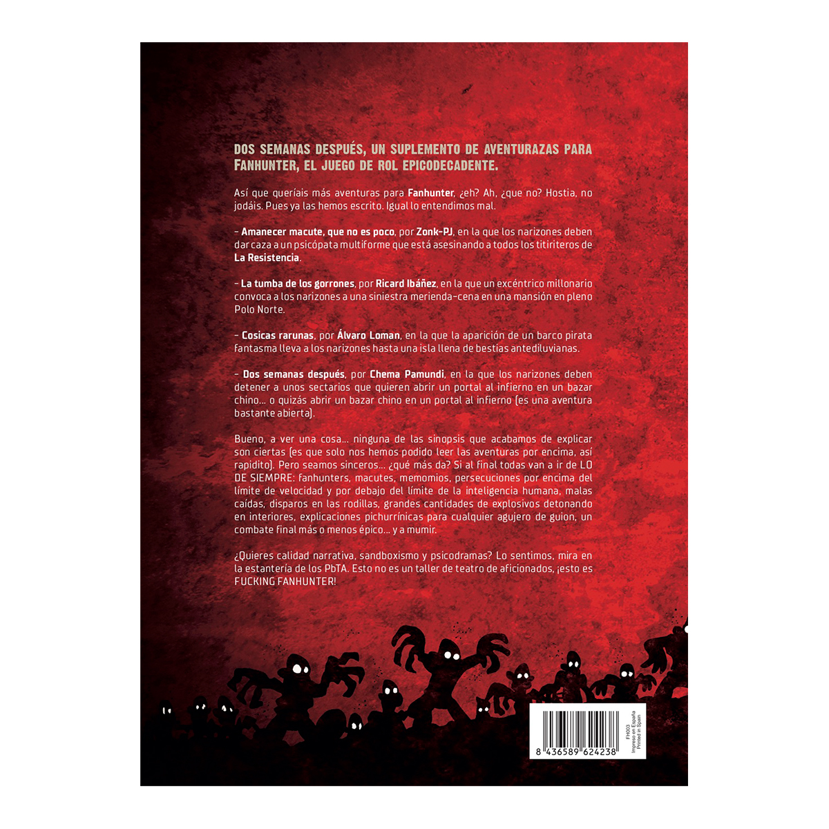 Dos semanas después, un suplemento de aventurazas para Fanhunter, el juego de rol epicodecadente formado por cuatro aventuras: Amanecer macute, que no es poco; La tumba de los gorrones; Cosicas rarunas y Dos semanas después.